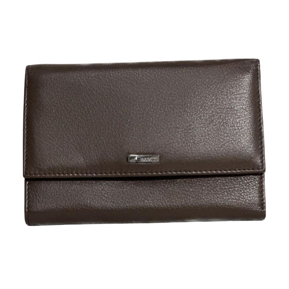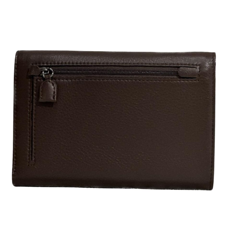 Portafoglio donna in pelle marrone, nell'interno tasca per banconote,  tasche laterali per documenti e carte di credito, tasca centrale per monete con chiusura a patta. Tasca esterna con chiusura a zip Misure: L 17 cm. x P 3 cm. x A 11 cm. Ampiezza aperto 30 cm.