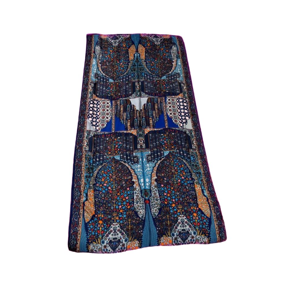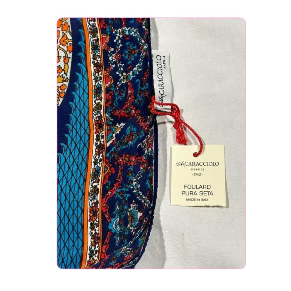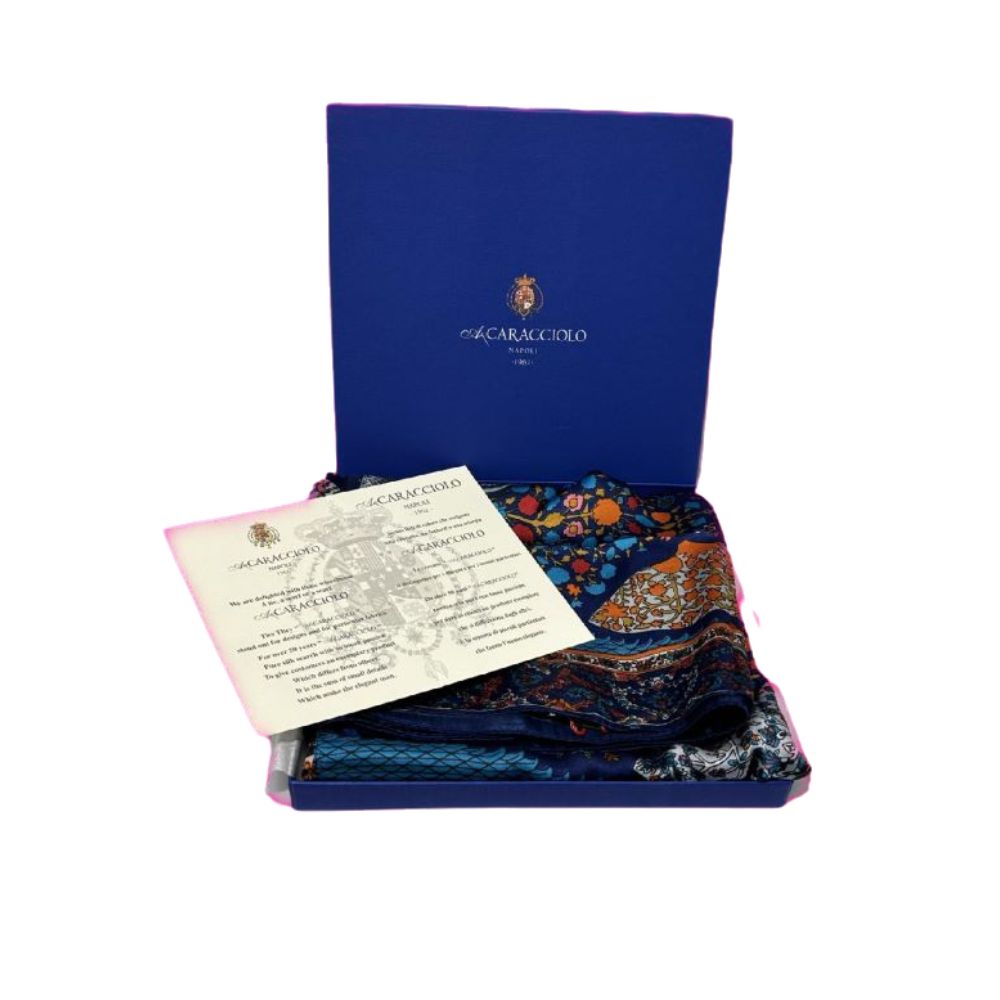 Sciarpa 100% seta stampata disegno cachemire su fondo blu.