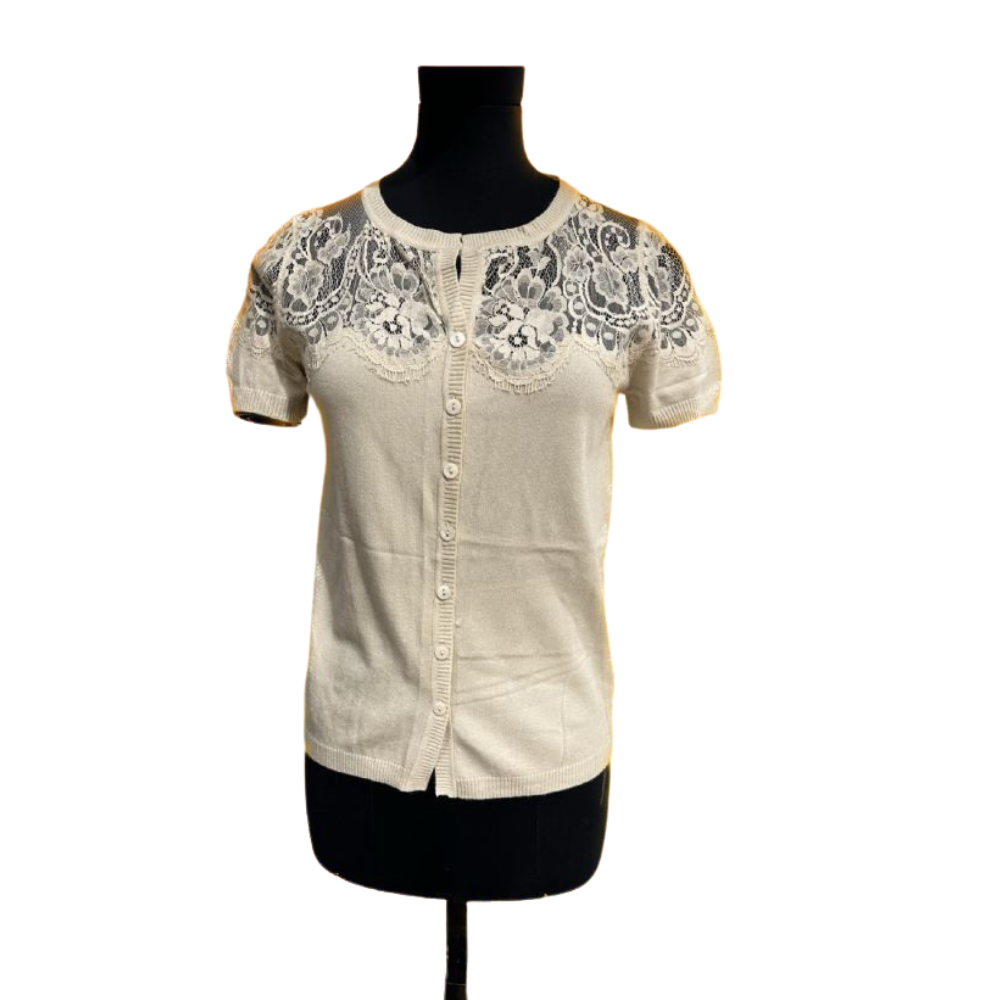 Maglia manica corta con inserti in pizzo Composizione: Corpino e maniche  72% viscosa 28% elastam Inserti in pizzo 60% cotone 40% poliammide Colore ecrù Taglia M Misure: Circonferenza torace 83 cm. Larghezza spalle 35 cm. Lunghezza manica  19,5 cm. Lunghezza 54 cm. Condizioni buone