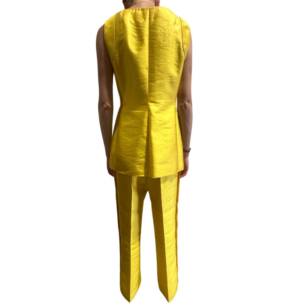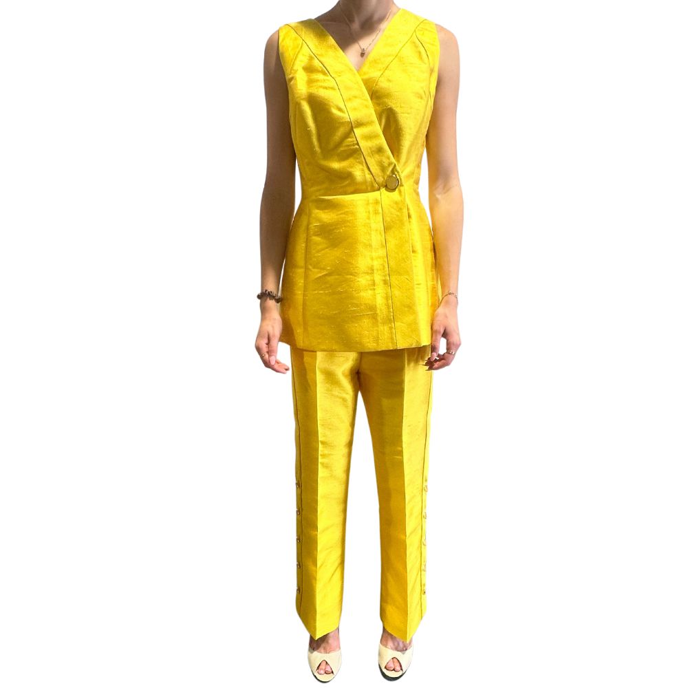 Completo pantalone in shantoon di seta 100%, decorato sulle gambe nei lati esterni da una fila di bottoni. Corpetto incrociato con scollo a V.