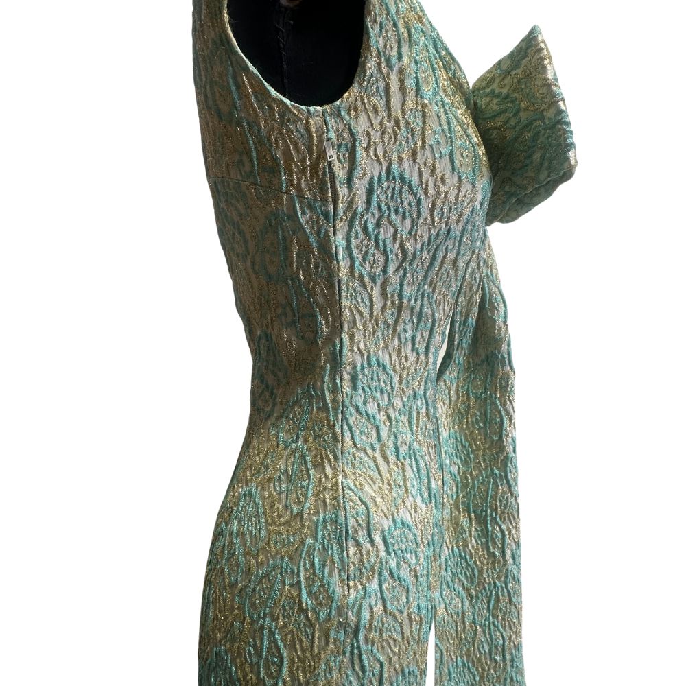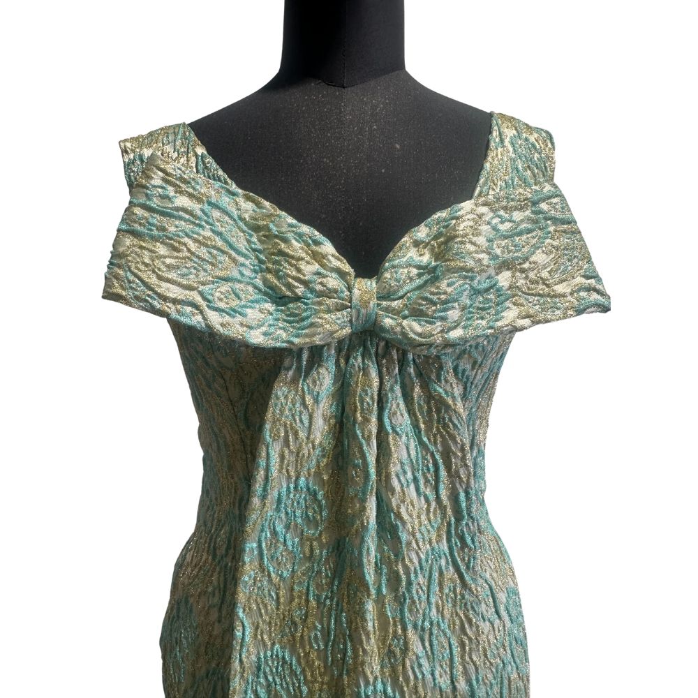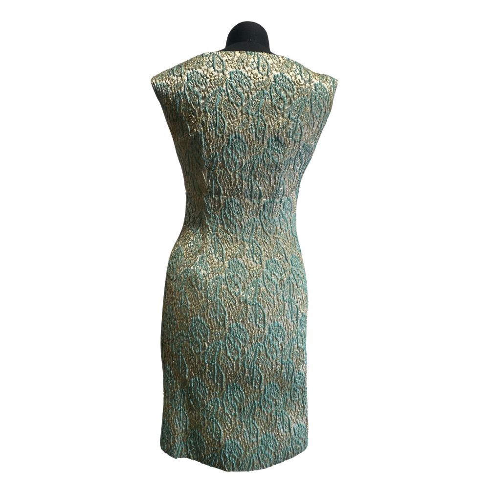 In broccato nelle tonalità del verde, con fili oro.