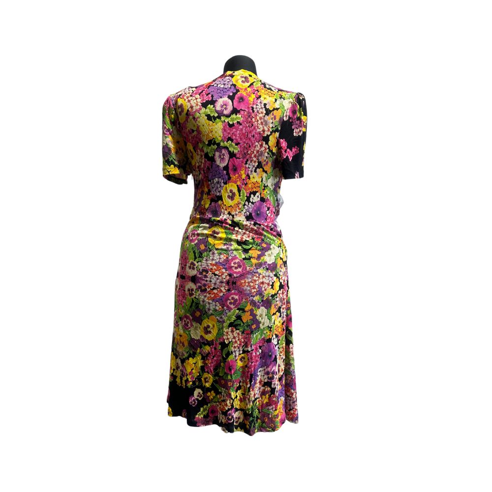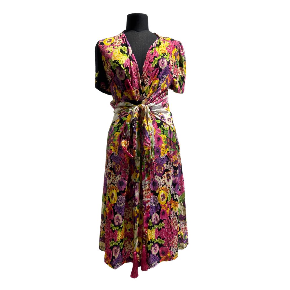 Abito in Jersey con applicazioni lungo la vita in seta pura. Fantasia floreale nei toni del giallo e arancio.