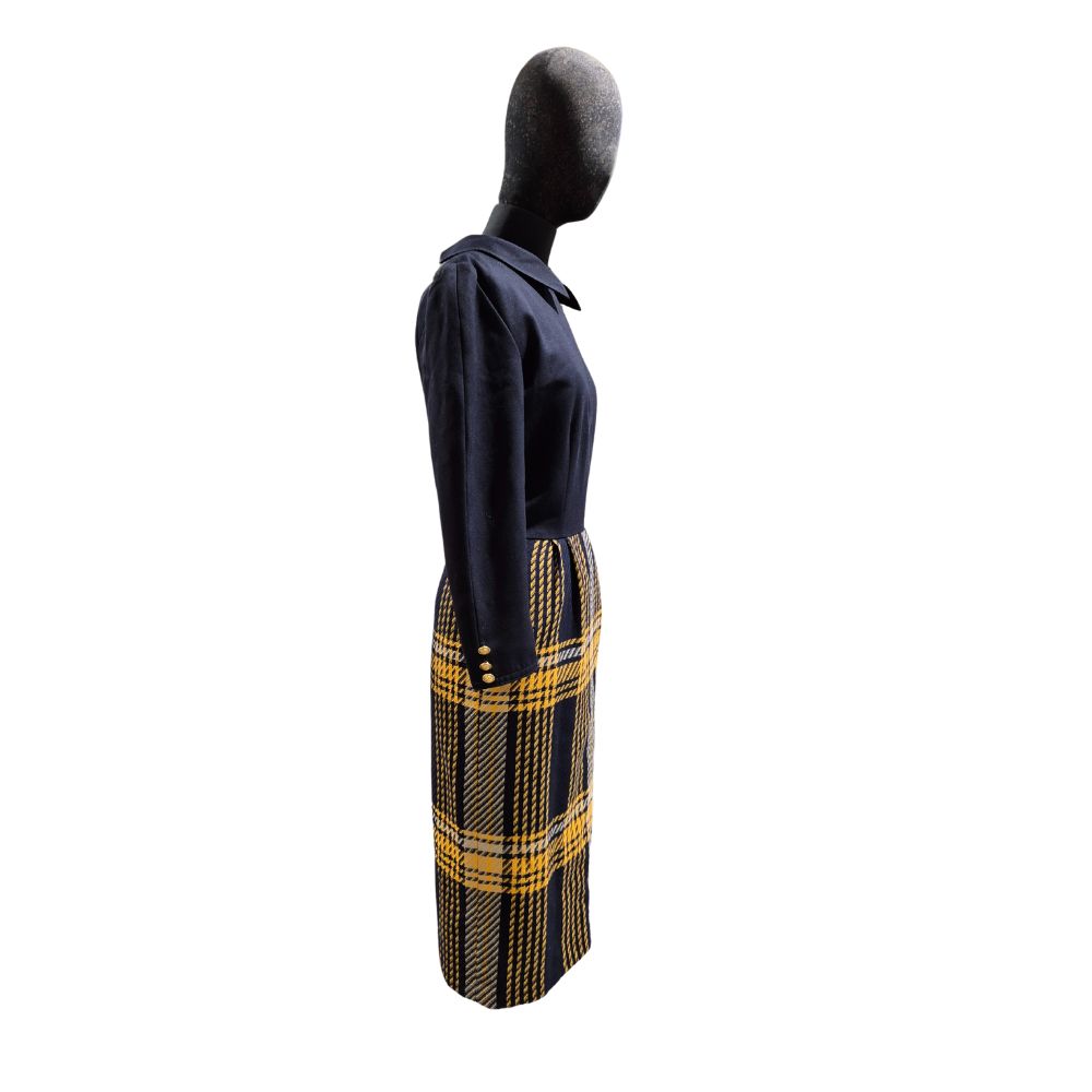 Abito in pura lana a maniche lunghe con bottoni oro sul polisino. Corpino aderente con colletto blu.