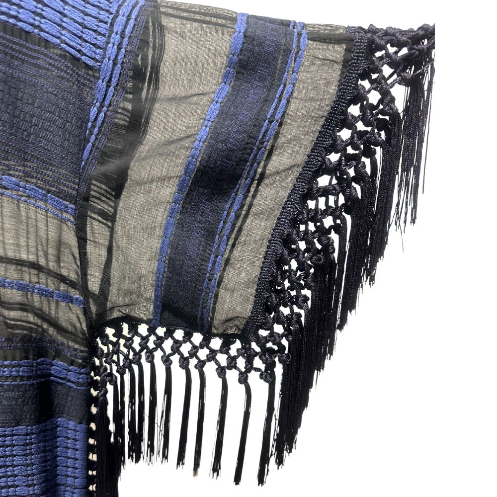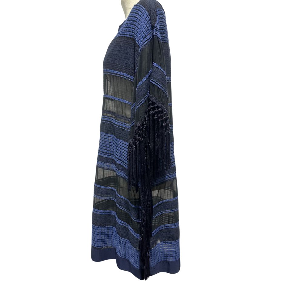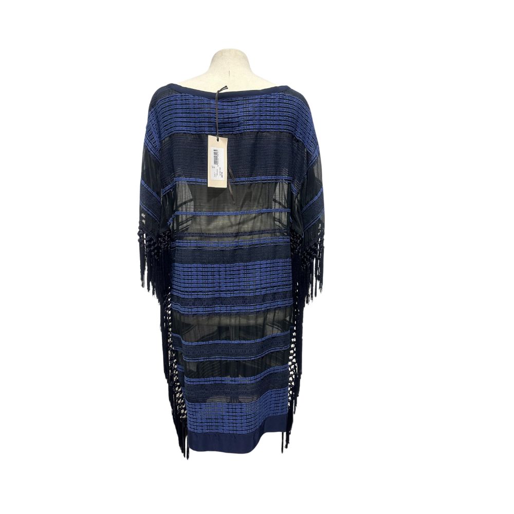 Garage nouveau. Abito con trasparenze in vita, mainca corta, taglio a chimono con frange come da foto. Nero e blu pacifico.
