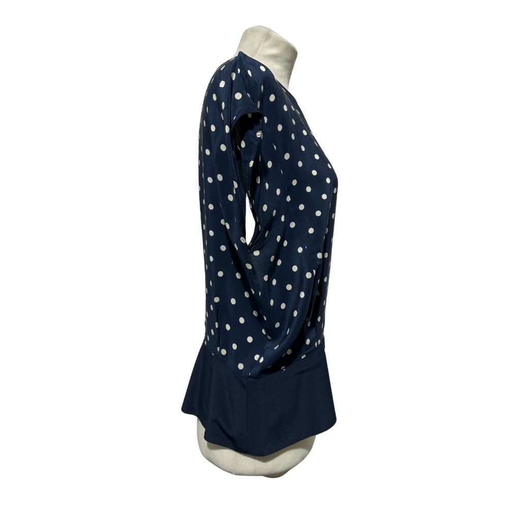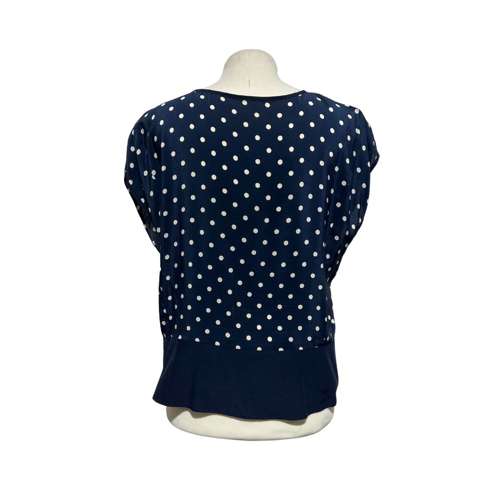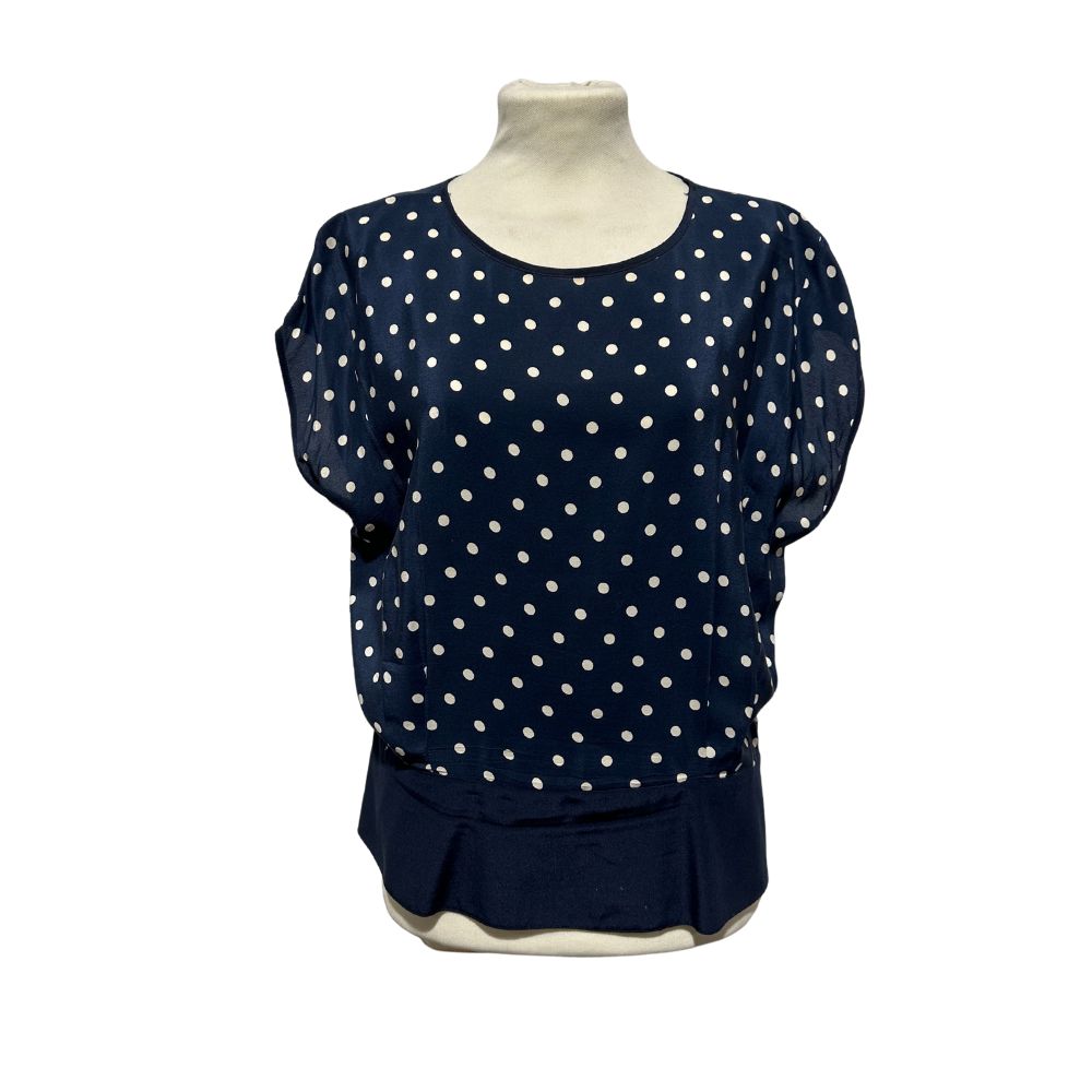 Blusa in pura seta a pois bianchi su fodo blu, a maniche corte